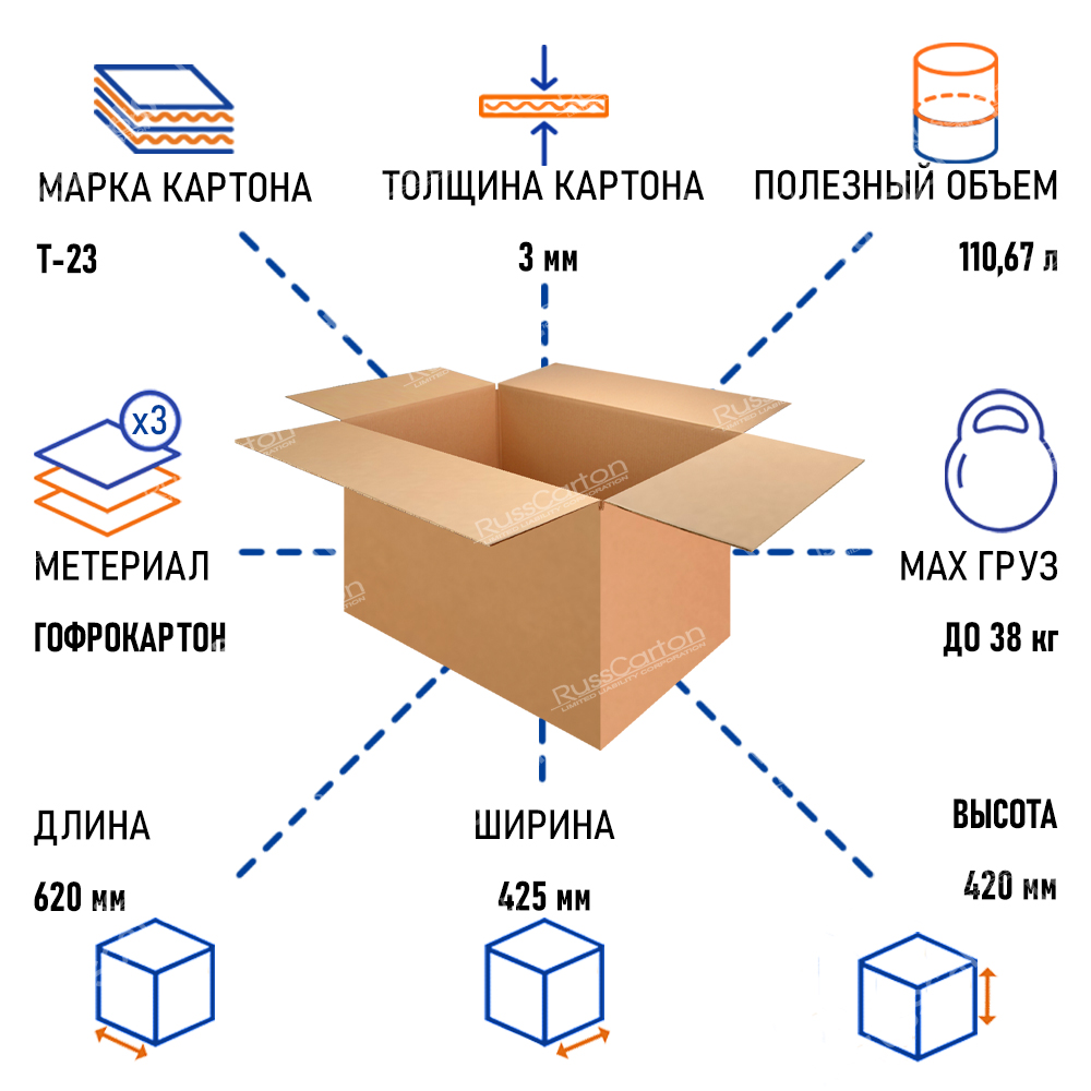 В пустом виде картонный гофрокороб легко и удобно складывается. Выполнен из трехслойного гофрокартона марки Т-23 бурого цвета. Размеры коробок указаны внутренние.