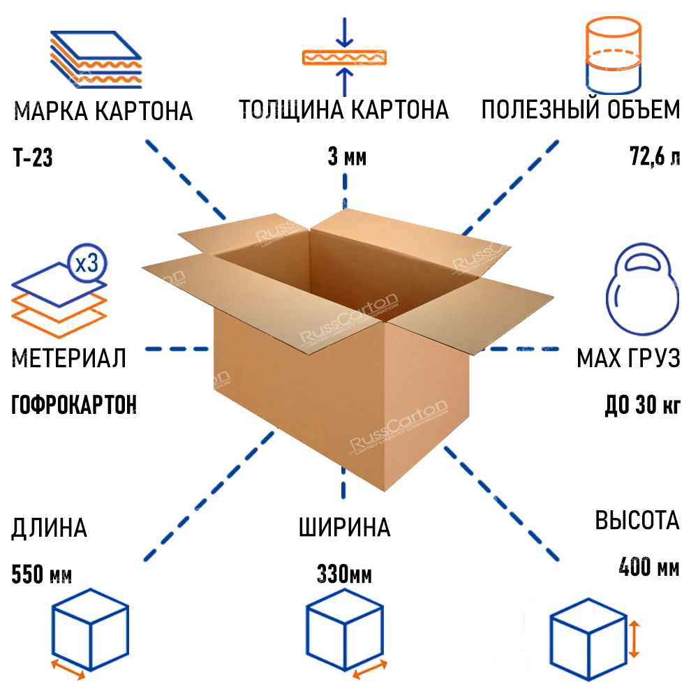 Картонная коробка размером 550х330х400 мм идеально подходит для транспортировки и хранения крупногабаритных товаров. Изготовленная из прочного гофрокартона, она надежно защищает содержимое от внешних воздействий. Благодаря удобным размерам, коробка пригодна для упаковки бытовой техники, электроники и других объемных предметов. Простота в сборке и разборке помогает сэкономить время при подготовке к отправке. Коробка сделана из экологически безопасного материала, пригодного для вторичной переработки.
