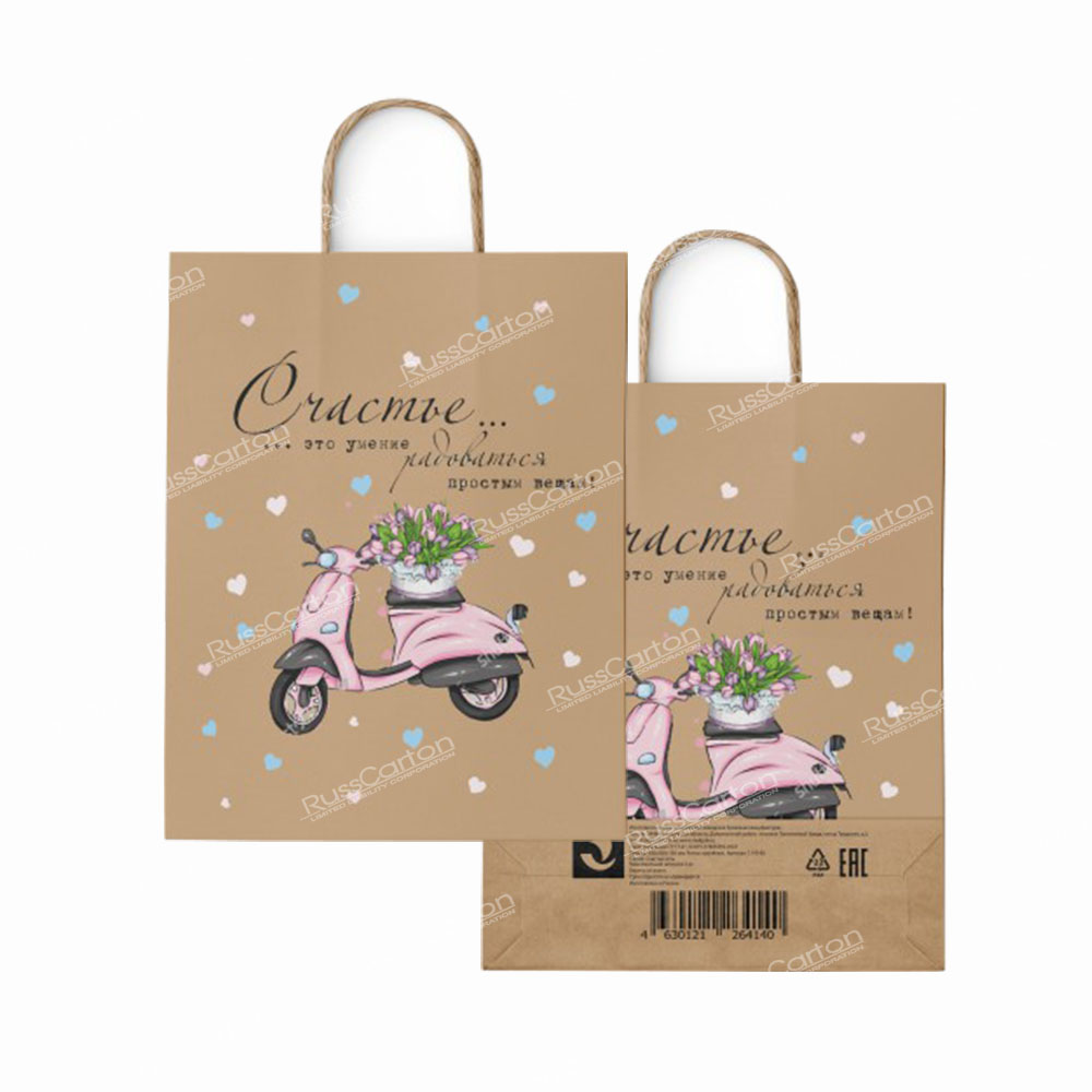Крафт-пакет идеально подходит для упаковки подарков, сувениров, одежды и других товаров. Удобные крученые ручки рассчитаны на среднюю нагрузку, что делает его практичным для покупок. Размер 35х26х15 см позволяет разместить внутри как компактные, так и более объемные предметы. Изготовленный из прочного и экологически чистого материала, пакет гарантирует надежность использования. Стильный дизайн с надписью «Счастье есть» придаёт упаковке особую эстетичность. Этот пакет отлично подходит для розничной торговли, мероприятий и магазинов подарков — идеальный вариант для бизнеса, который ценит стиль и функциональность.